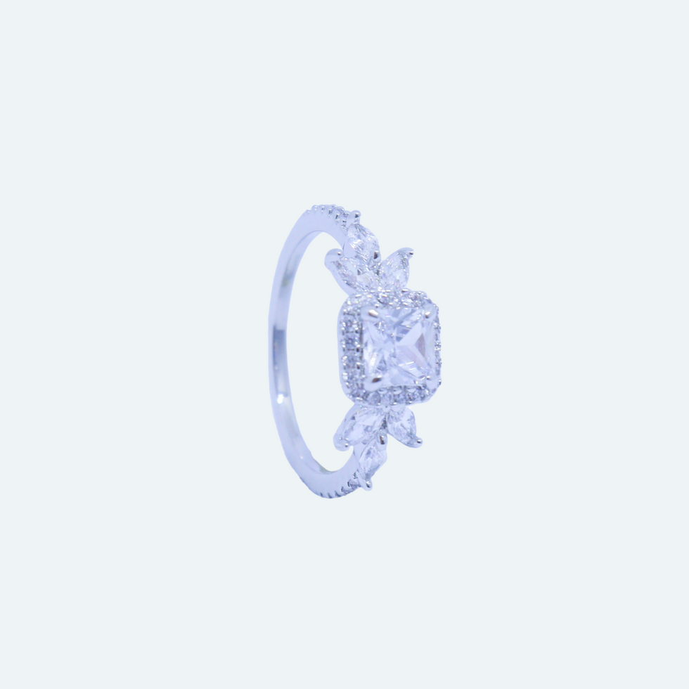 Square cut Zircon Silver Cluster Leaf Ring - Silver